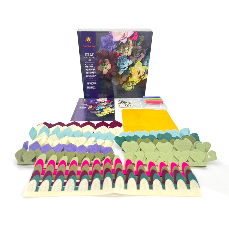 “Includes 3 chalk pastels, 20 felt shapes, 26 rubber bands, one 6.5″ square (16.5cm) paperboard frame, 13 pieces of double-sided adhesive.”
