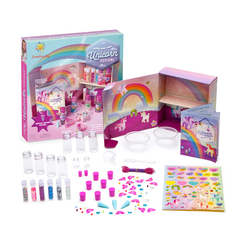 “Includes 1 potion cabinet box,1 instruction booklet,9 plastic vials with 9 foam corks,1 plastic spoon,2 plastic cups,1 plastic funnel,54 stickers,6 vials of glitter totaling 0.19oz(5.4g),26 plastic gems,3 plastic unicorn horns,15pcs metallic foil confetti,2 yds(1.8m) cotton thread,2 metal rings.”
