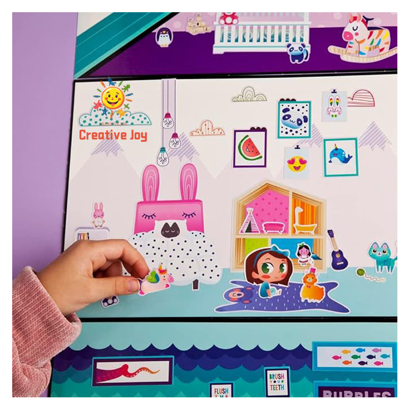 “Let your imagination run wild with an awesome 3-foot tall dream home that sticks right to your wall (it’s paint safe)! Have hours of fabulous fun decorating and re-decorating with over 650 repositionable, imaginative stickers.”
